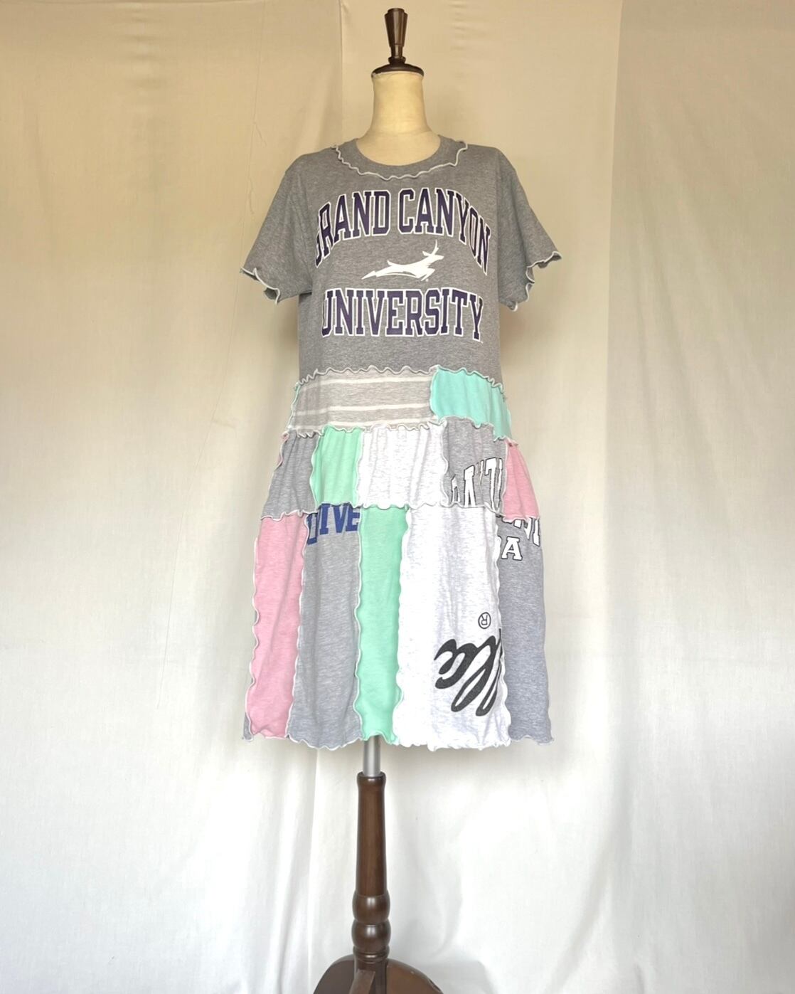 U.S.A.古着Tシャツをたくさん組み合わせてリメイクした一枚で着用できるミニ丈のワンピースです。