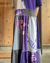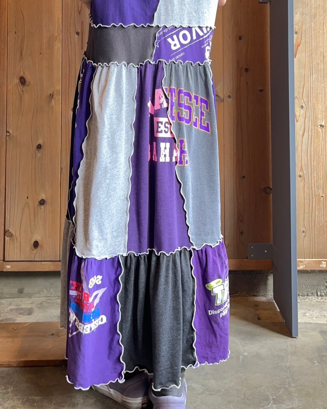 パープル系のU.S.A.古着Tシャツを組み合わせ、白のメロウロックで仕上げたリメイクワンピースです。