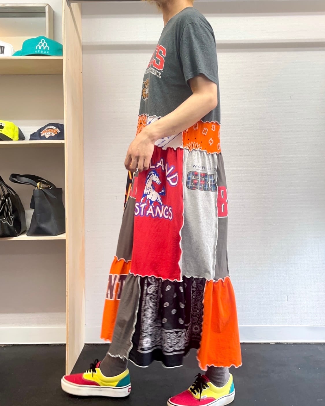 U.S.A.古着Tシャツとバンダナを組み合わせ、カラフルでありながらまとまりを意識して配色したマキシ丈のリメイクワンピースです。