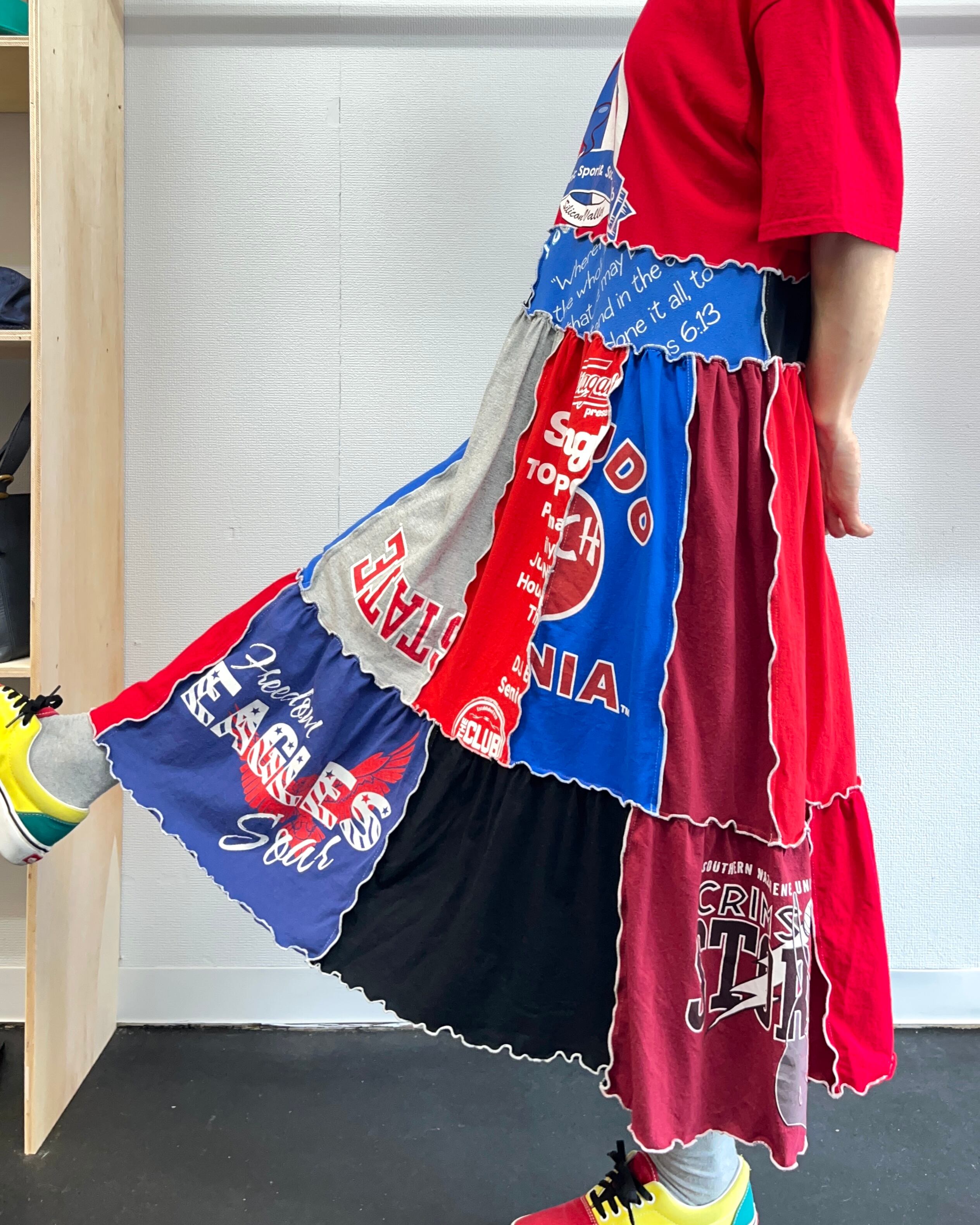 レッド/ブルー系のU.S.A.古着Tシャツを組み合わせ、白のメロウロックで仕上げたリメイクワンピースです。トップ部分はXLサイズを使用。スカート部分もたっぷり生地を使用しゆったりしたフィットになっております。