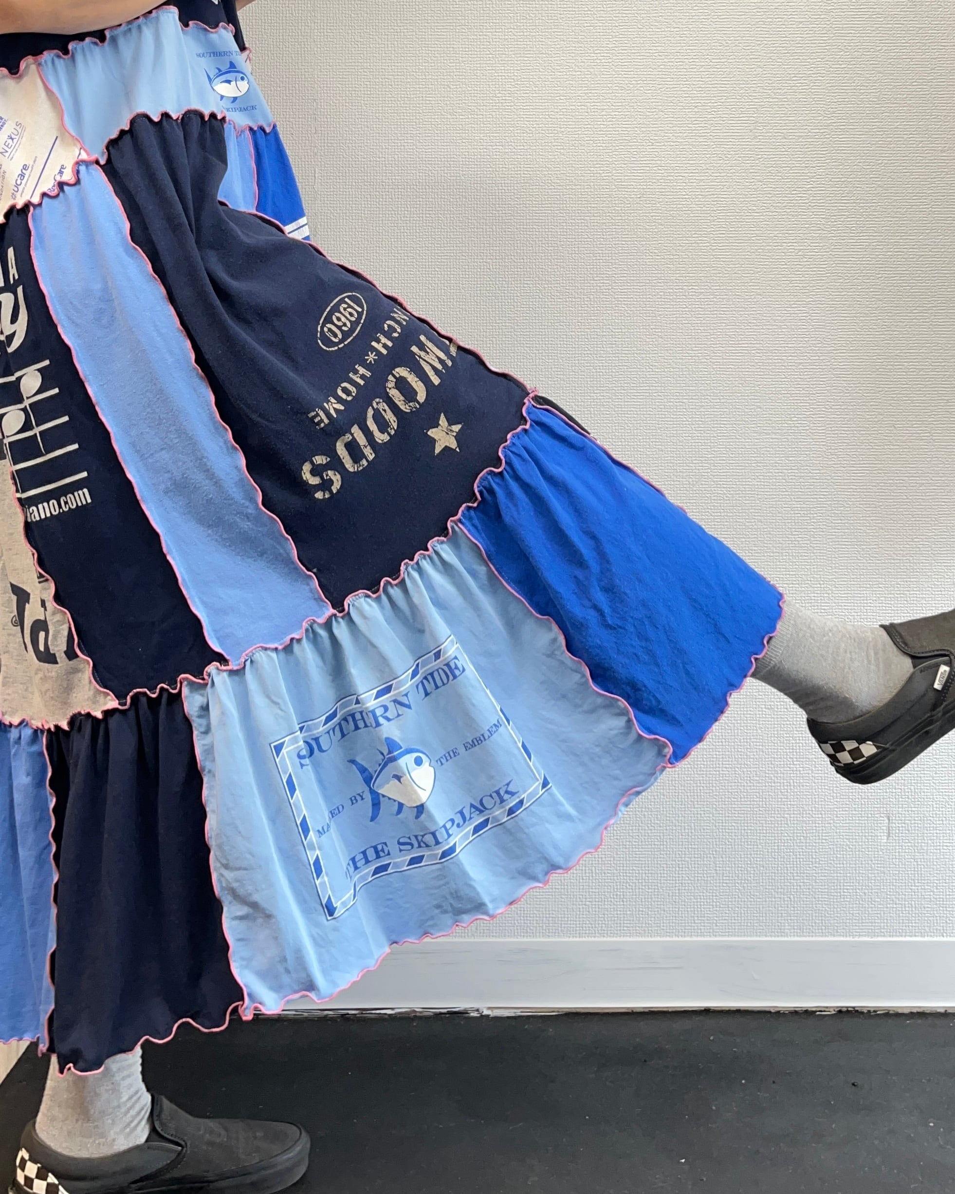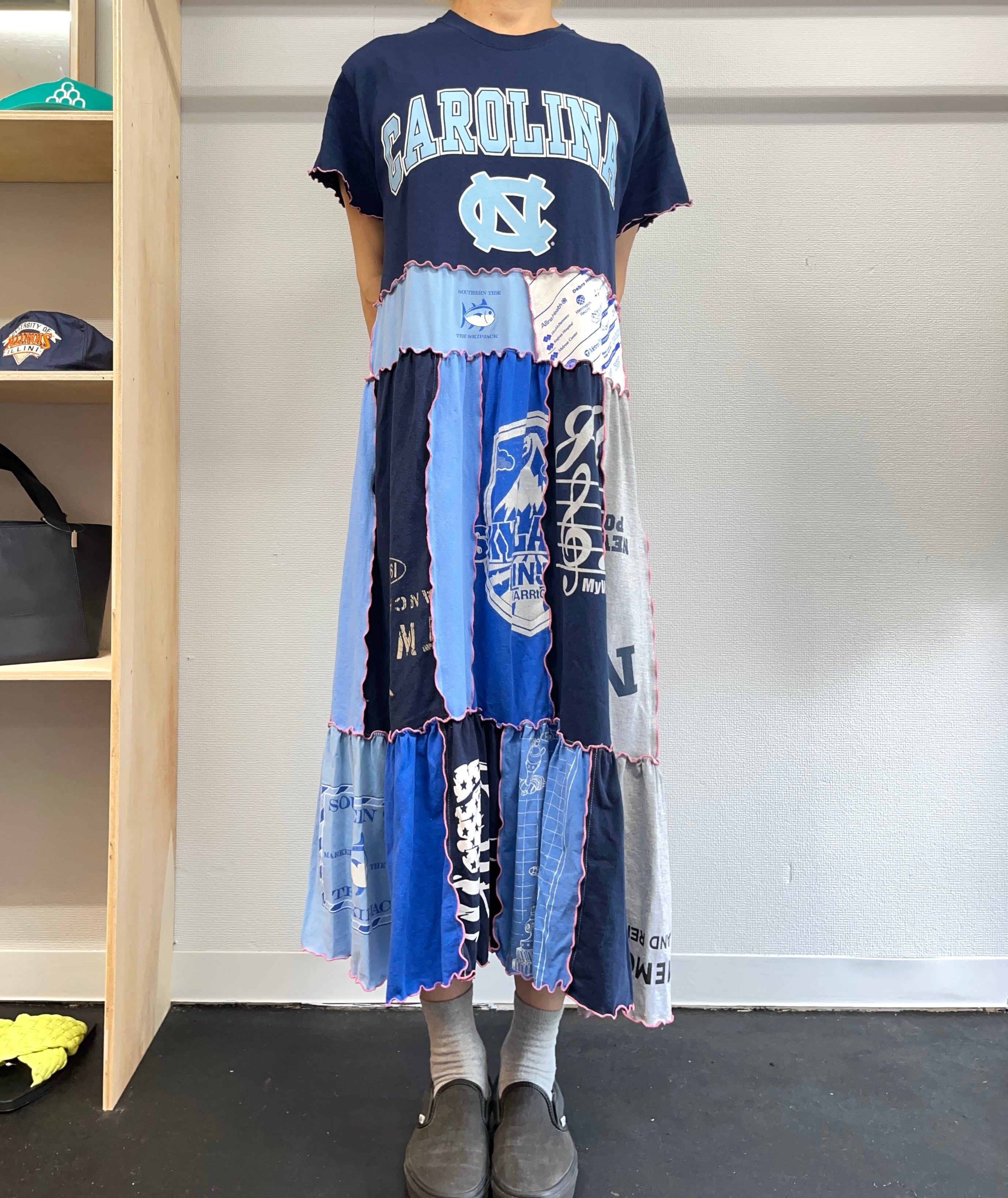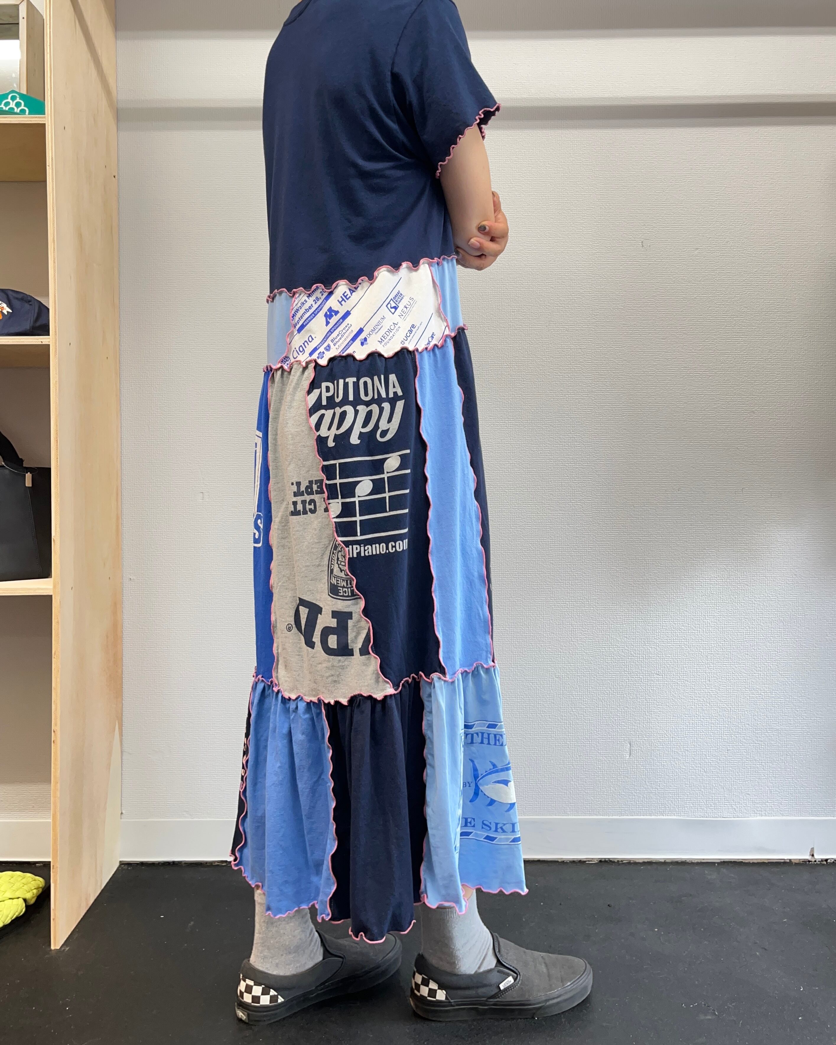 ネイビー/ブルー系のU.S.A.古着Tシャツを組み合わせ、ピンクのメロウロックで仕上げたリメイクワンピースです。トップ部分はMサイズTシャツを使用しています。