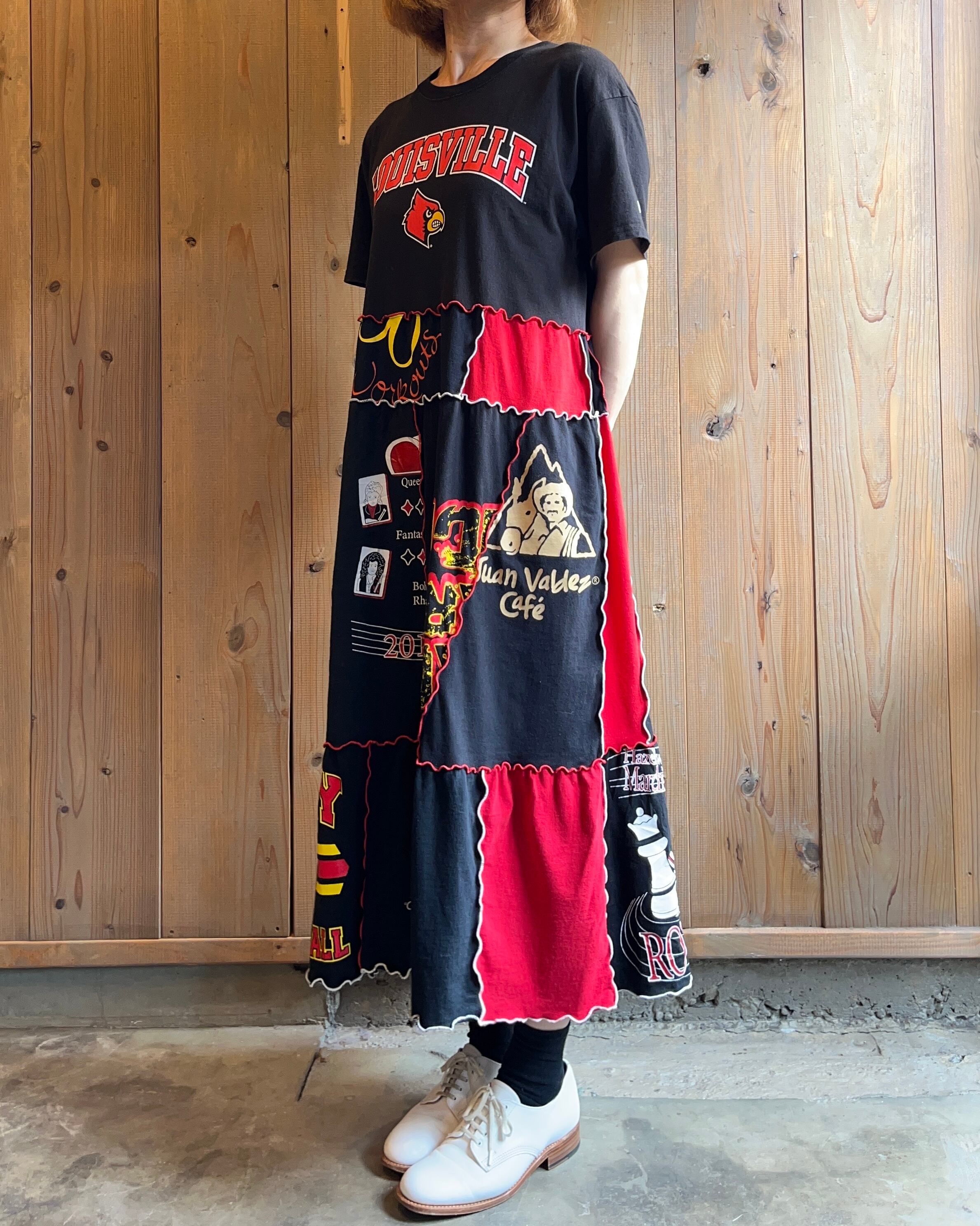黒と赤のU.S.A.古着Tシャツをリメイクしたワンピースです。プリントも赤系のものを選び統一感を持たせ、赤と白のメロウロックで仕上げました。