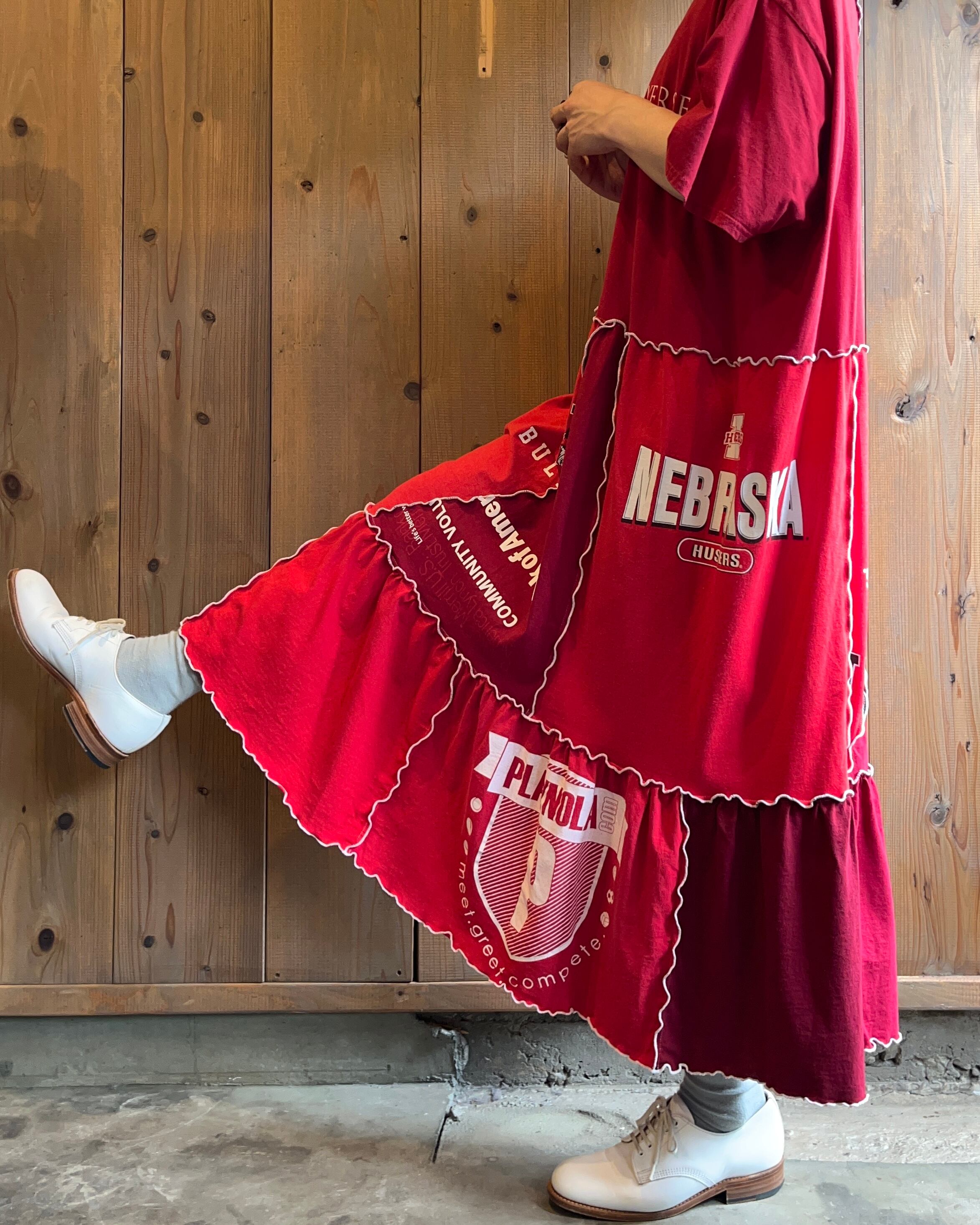 いろいろなお色味のレッド系のU.S.A.古着Tシャツを組み合わせ、白のメロウロックで仕上げたリメイクワンピースです。