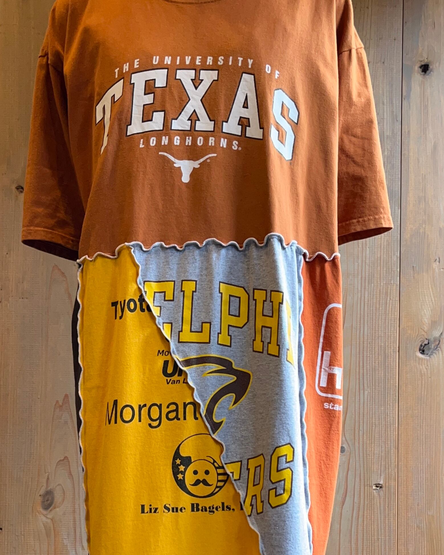 テラコッタ、ブラウン、オレンジ、イエロー系のU.S.A.古着Tシャツを組み合わせ、白のメロウロックで仕上げたリメイクワンピースです。