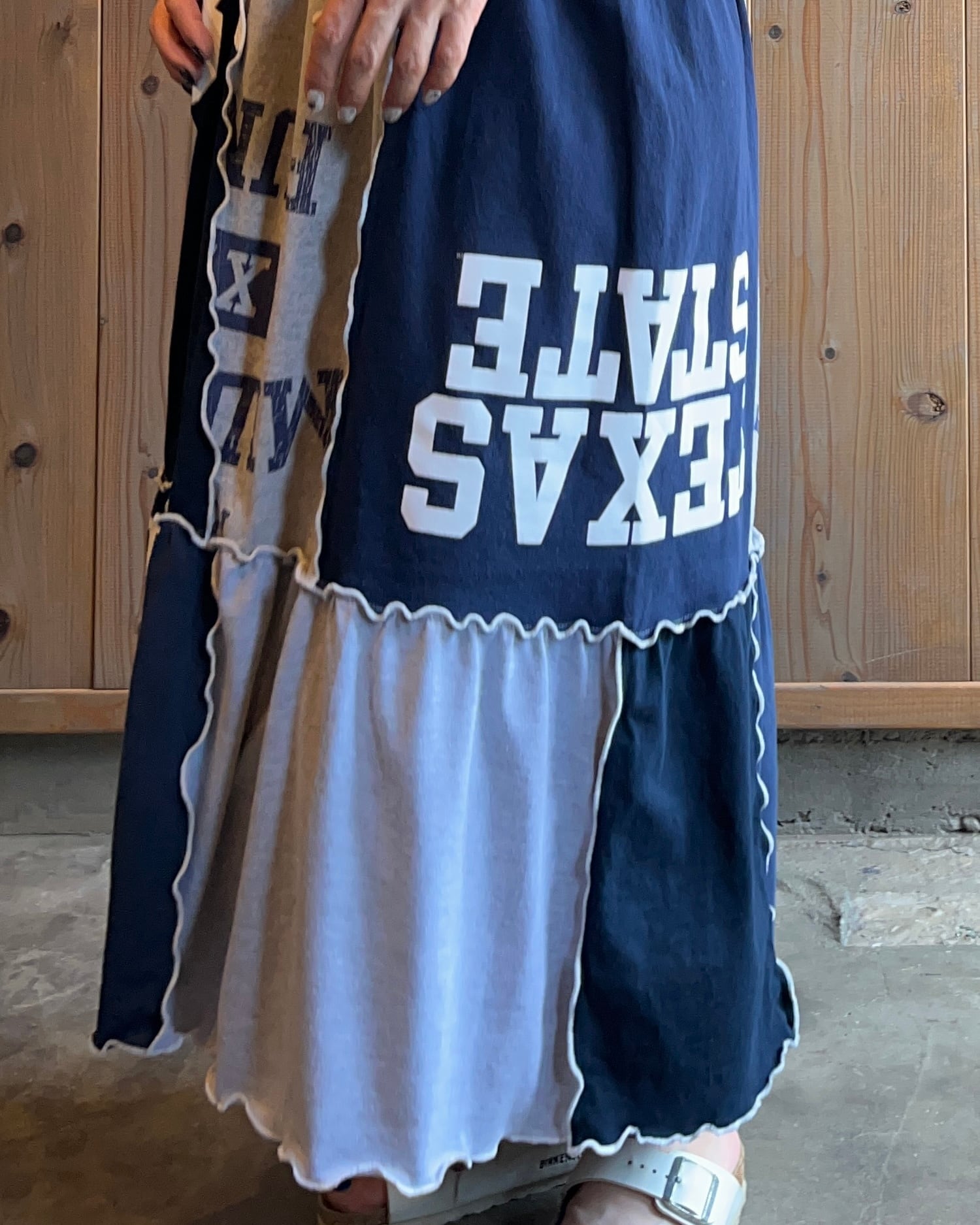 ネイビー/白プリント、グレー/ネイビープリントのスポーツチーム系U.S.A.古着Tシャツを組み合わせたリメイクワンピースです。Mサイズ程度、長さも控えめですので小柄さんにもおすすめです。