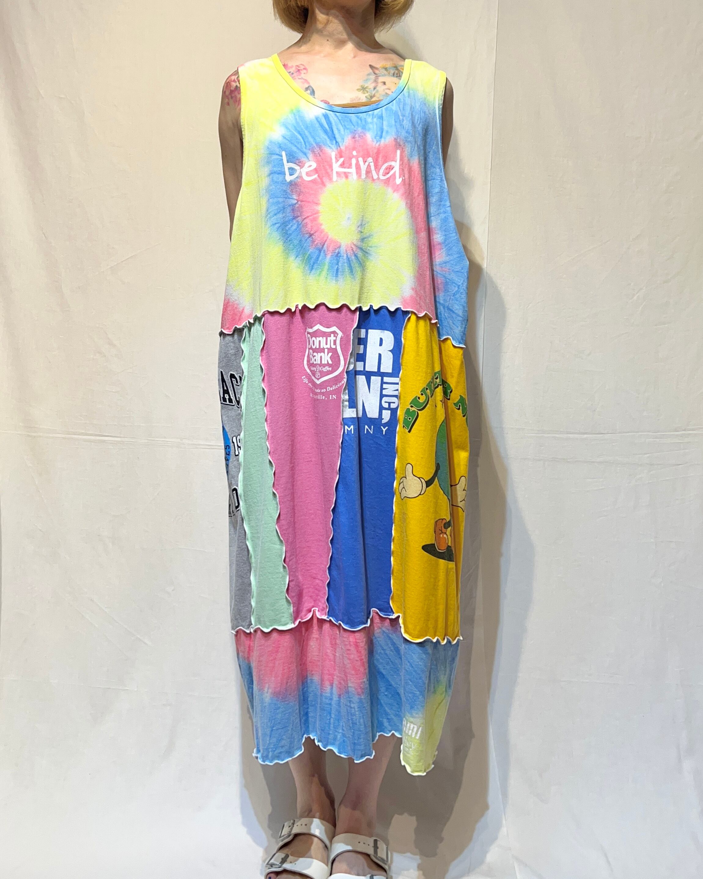 タイダイタンクトップをトップに使い、カラフルなU.S.A.古着Tシャツを組み合わせ、白のメロウロックで仕上げたリメイクワンピースです。